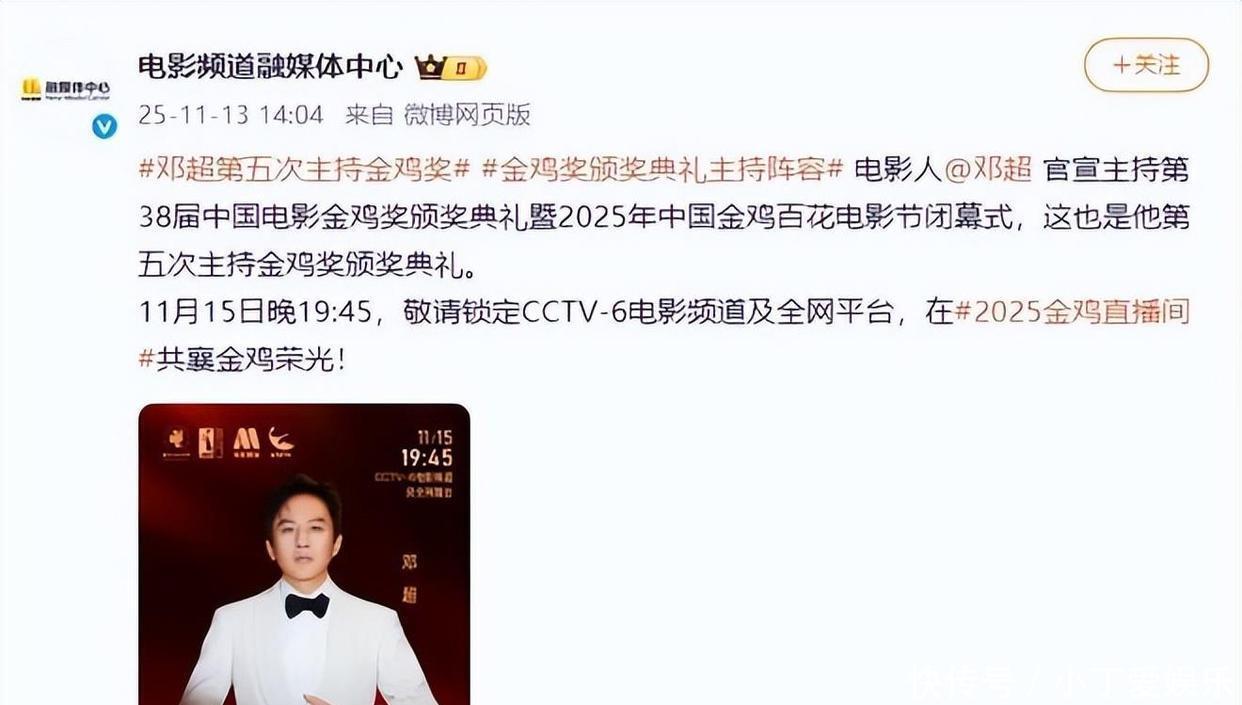 这个官方媒体亲自宣布啦,祝贺邓超成为第38届中国电影金鸡奖颁奖典礼以及2025年中国金鸡百花电影节闭幕式的主持人。