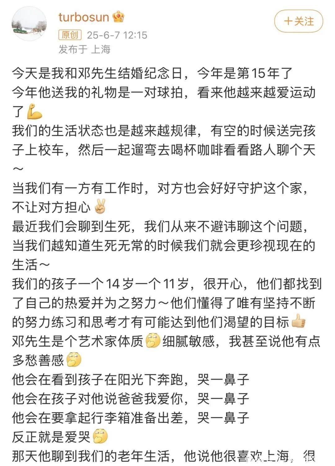 2025年6月7日,孙俪在微博发文,庆祝和邓超十五周年的纪念日。