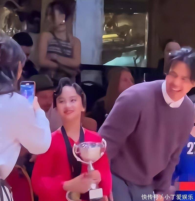 看到女儿扶着奖杯,她忍不住用手机拍下这个让人自豪的瞬间。