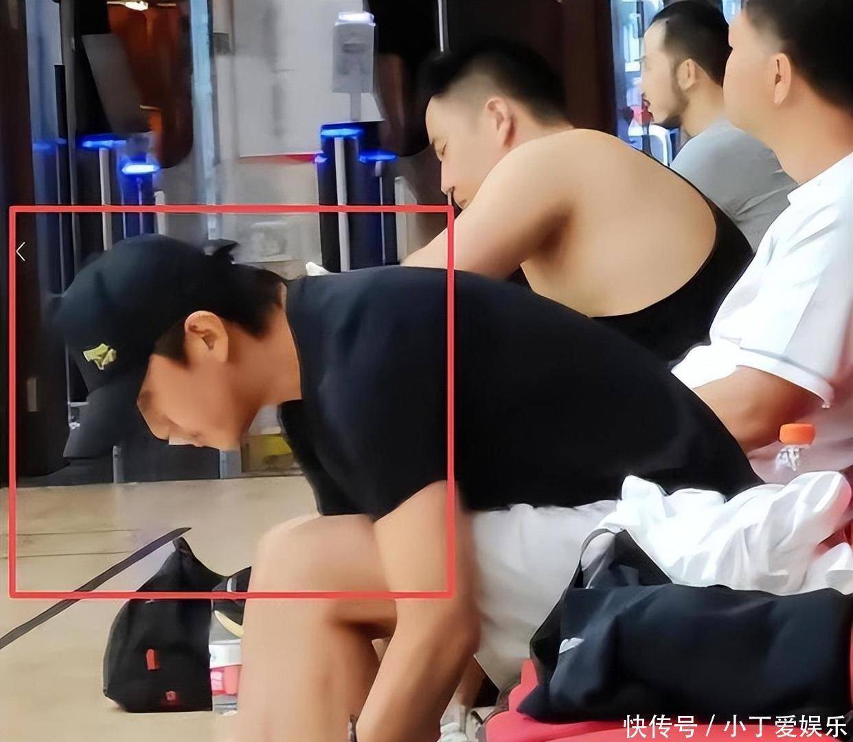 他整个身子都穿着一套黑色的运动装,正陪着孩子一块儿上课呢。